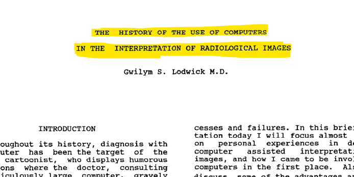 Non avevo mai pensato di cercare come e dove era nato l’utilizzo dell’Intelligenza Artificiale in ambito radiologico , andando a cercare in vari testi posso dire que il primo articolo che parla di diagnostica assistita dalle macchine risale al 1963 scritto da Lodwick G.S. dal titolo Computer diagnosis of primary bone tumors. Non sono riuscito a trovare l’articolo orinale, ma in compenso ho trovato un’interessantissimo articolo dello stesso autore (Lodwick) che descrive il suo percorso dell’ambito dell’informatica applicata alla diagnosi radiologica ed alcuni fatti interessanti successi intorno ad essa.
